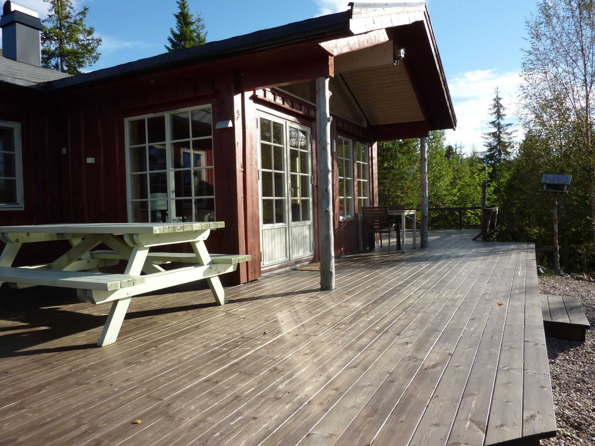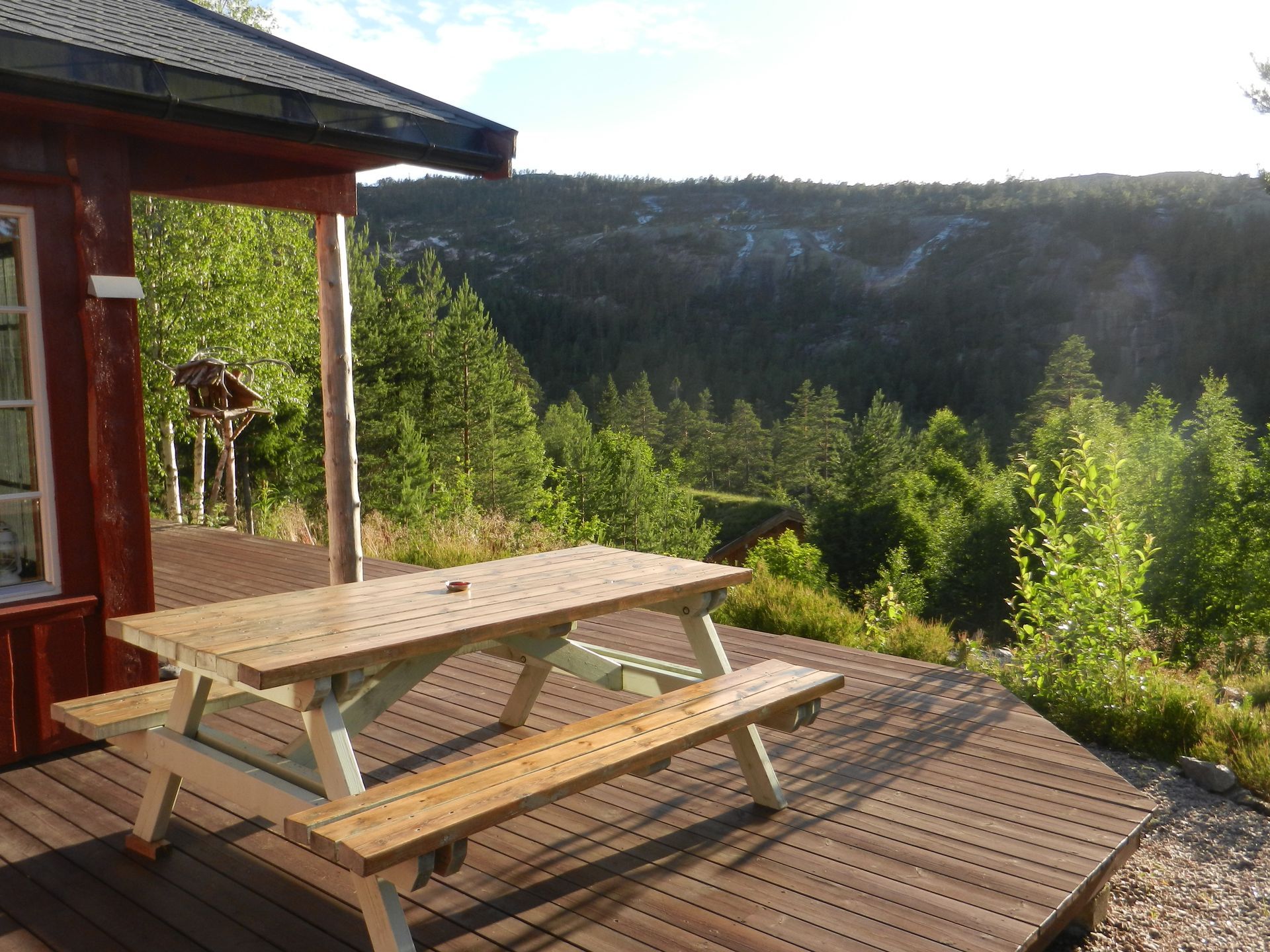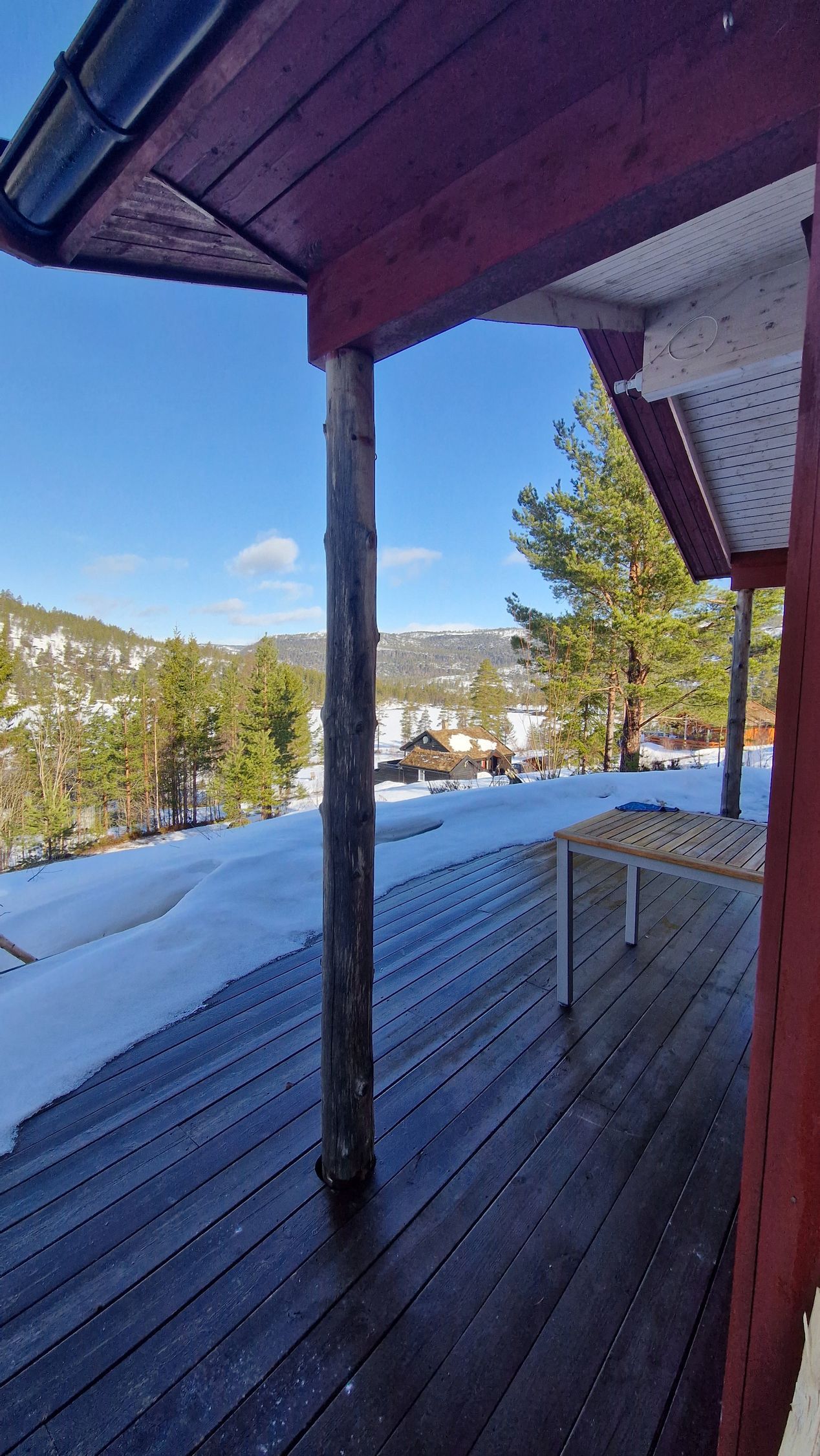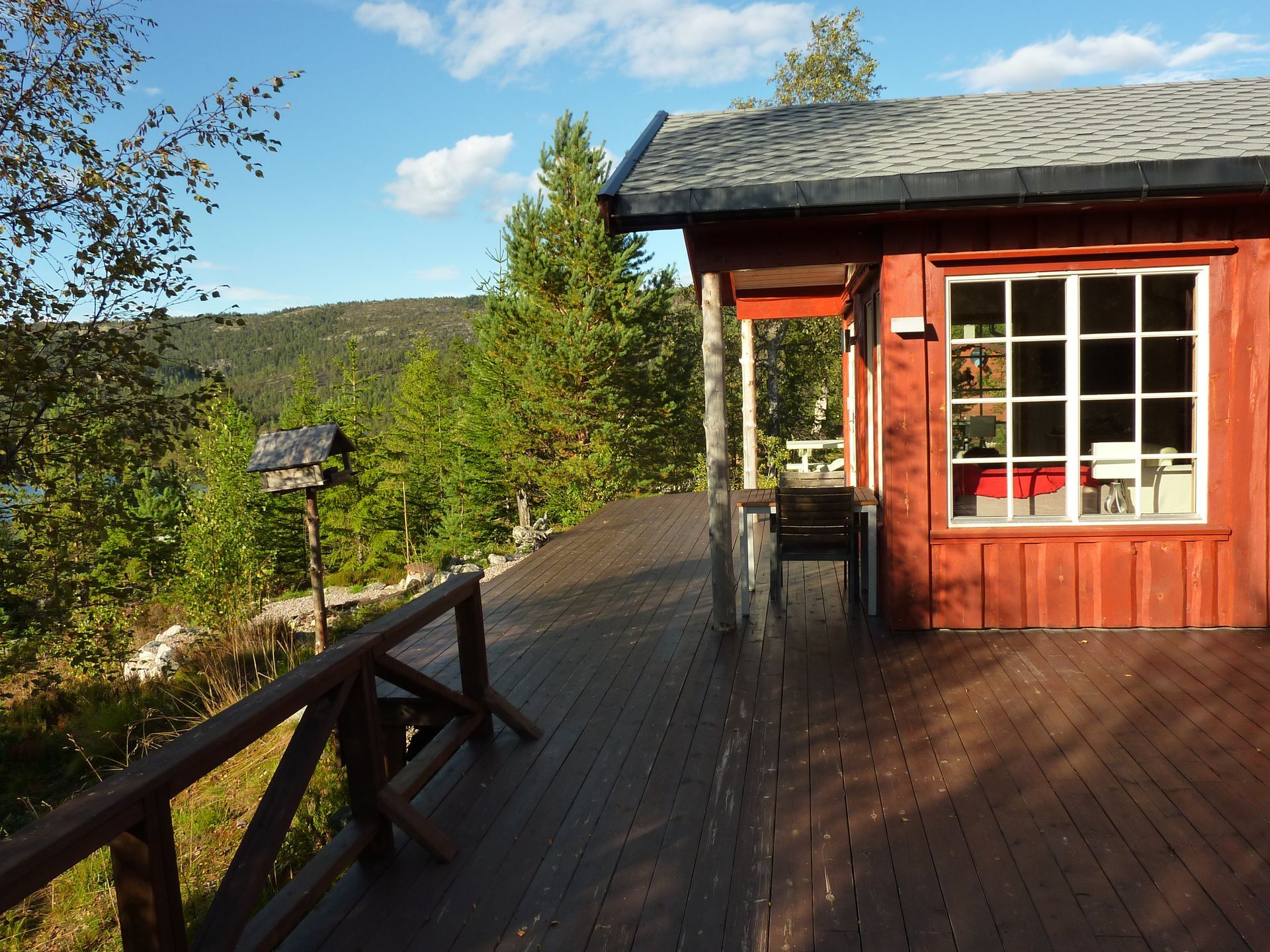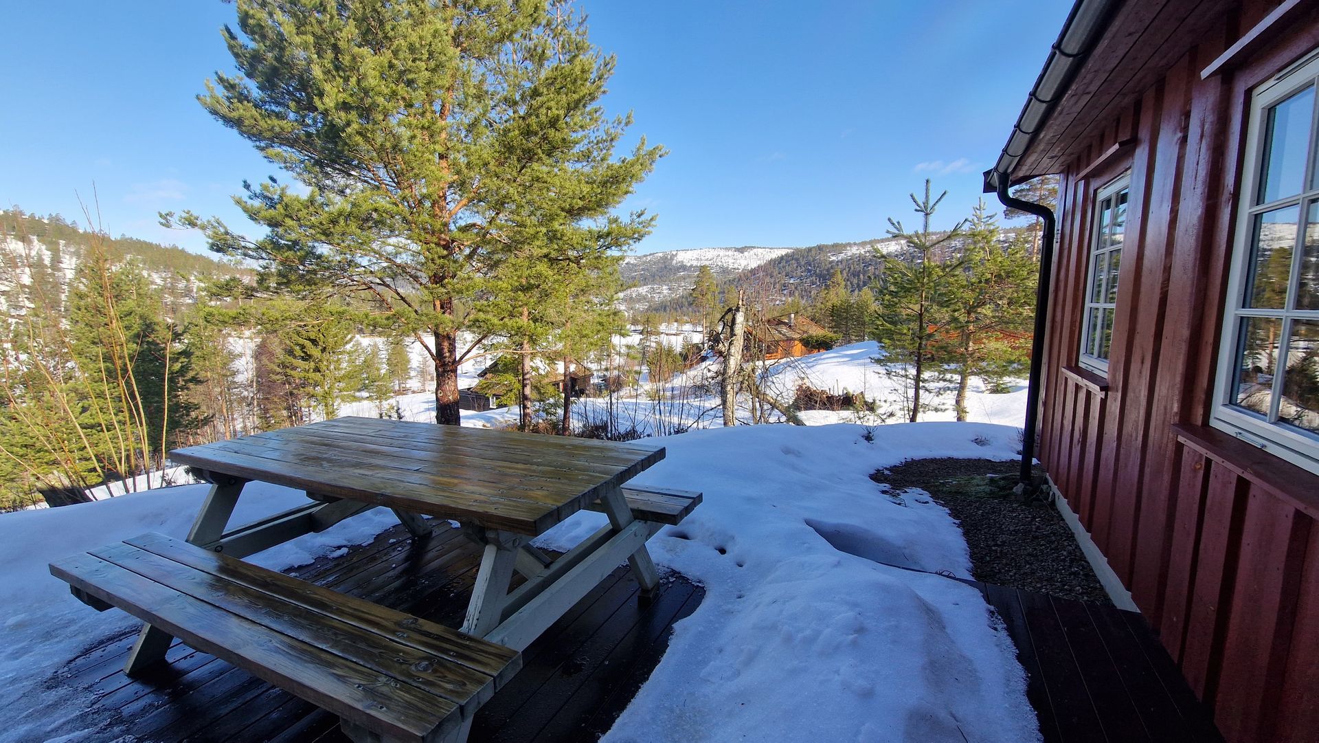 Im Aussenbereich lädt die ca. 75 m² große Terrasse mit einem tollen Blick auf den Havrefjell und Solholmsfjell zum Relaxen ein. Für die Terasse gibt es einen Holztisch mit Biergartenstühlen für 6 Personen, ein kleinen Holztische mit 4 Stühlen für 4 Personen, 2 Sonnenliegen, ein großes Sonnensegel - denn auch in Norwegen wird es im Sommer schnell mal über 30 Grad - sowie eine typisch norwegische, massive Sitzgruppe für 4-6 Personen.